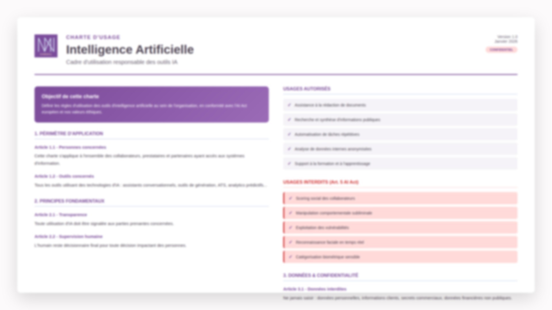 Formation aux usages responsables de l'IA et ateliers d'intelligence collective. Vos équipes savent ce qu'elles peuvent faire — et le font en confiance. Exemple de livrables : Support de formation, Charte IA validée, Plan d'actions etc..