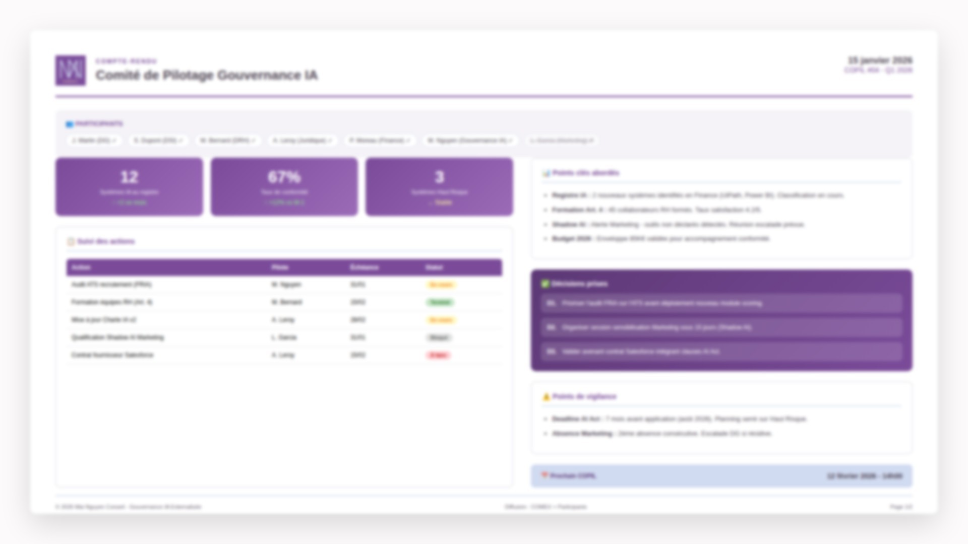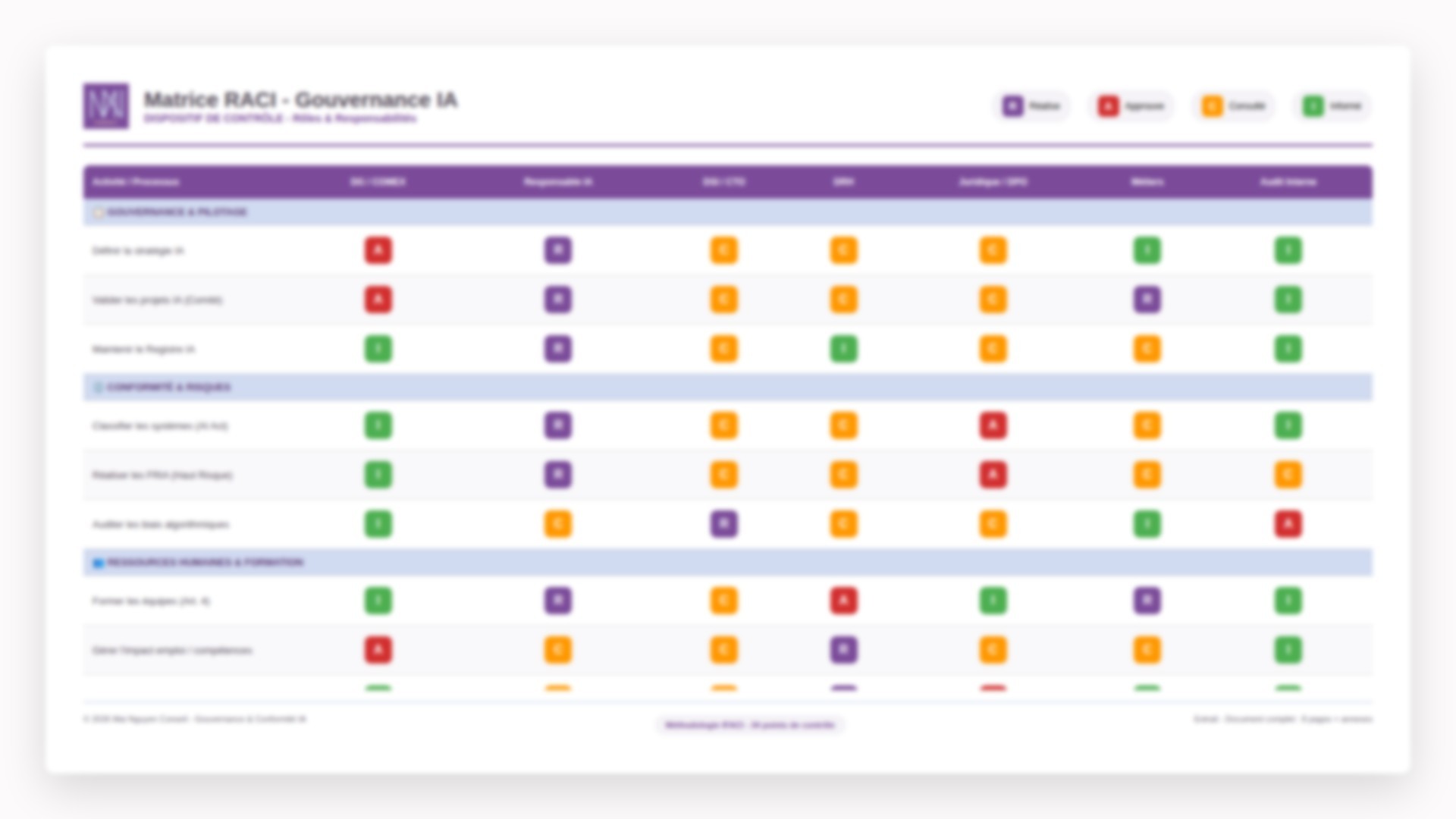 Qui décide quoi ? Métiers, DSI, direction : un RACI clair pour que chacun joue son rôle dans la durée Exemple de livrables : RACI Gouvernance, Charte du Comité IA, Procédures documentées, Kit d'animation Comité