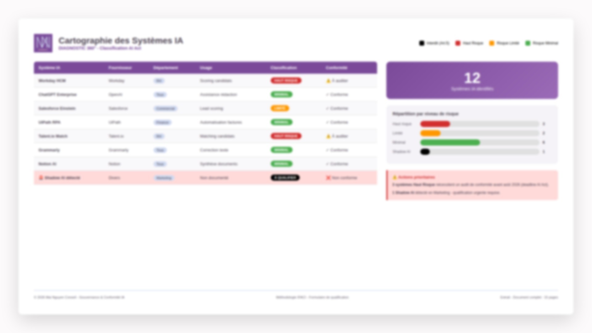 Quels outils IA dans quels métiers et quels sont les risques associés? Un état des lieux complet, en lien avec votre DSI. Exemple de livrable : Cartographie des usages IA, matrice classification AI Act, Gap analysis règlementaire, Présentation Comex